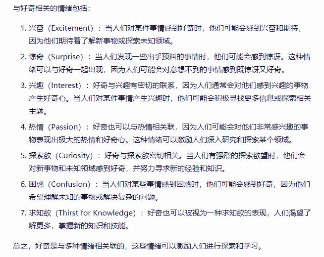情绪包括很多种:好奇心、焦虑、愤怒等等等,关于情绪包含哪些,建议大家用GPT工具搜情绪的关联词。