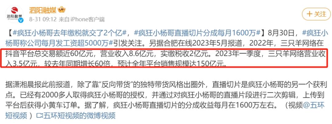 抖音、快手同样如此,疯狂的小杨哥 2022 年销售额接近 60 亿,一年交税 2 个亿,这个规模可见一斑。