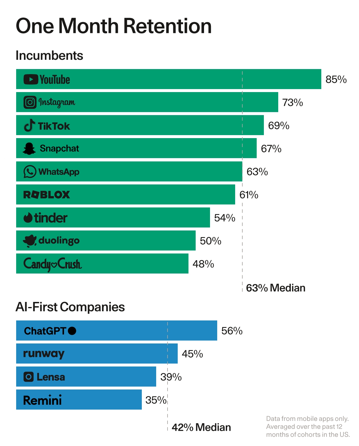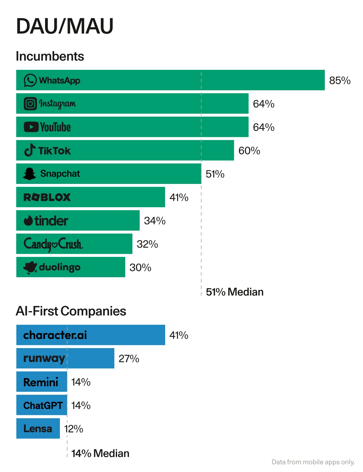 用户参与度也比较低迷。某些最好的消费品公司的 DAU/MAU (日活用户/月活用户)为 60-65%; WhatsApp 的比例为 85%。相比之下,生成式人工智能应用的中位数只有 14%(Character以及“人工智能伴侣”类应用除外)。这意味着用户还没有发现生成式人工智能产品有足够多的价值,能够让他们每天都用。