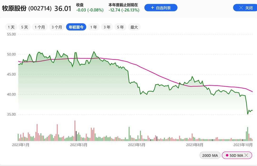以牧原股份为例:截至10月9日收盘,牧原股份股价收35.00元/股,跌幅7.63%,创2020年2月以来新低,目前市值1913亿元,市值蒸发近3000亿。