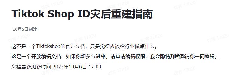 在事件发生之后,一份《 Tiktok Shop ID 灾后重建指南 》的飞书文档在从业者们的朋友圈疯传。从主播、运营们的工作问题,到商家货物甩卖途径、资源对接群等等,所有可用信息事无巨细。