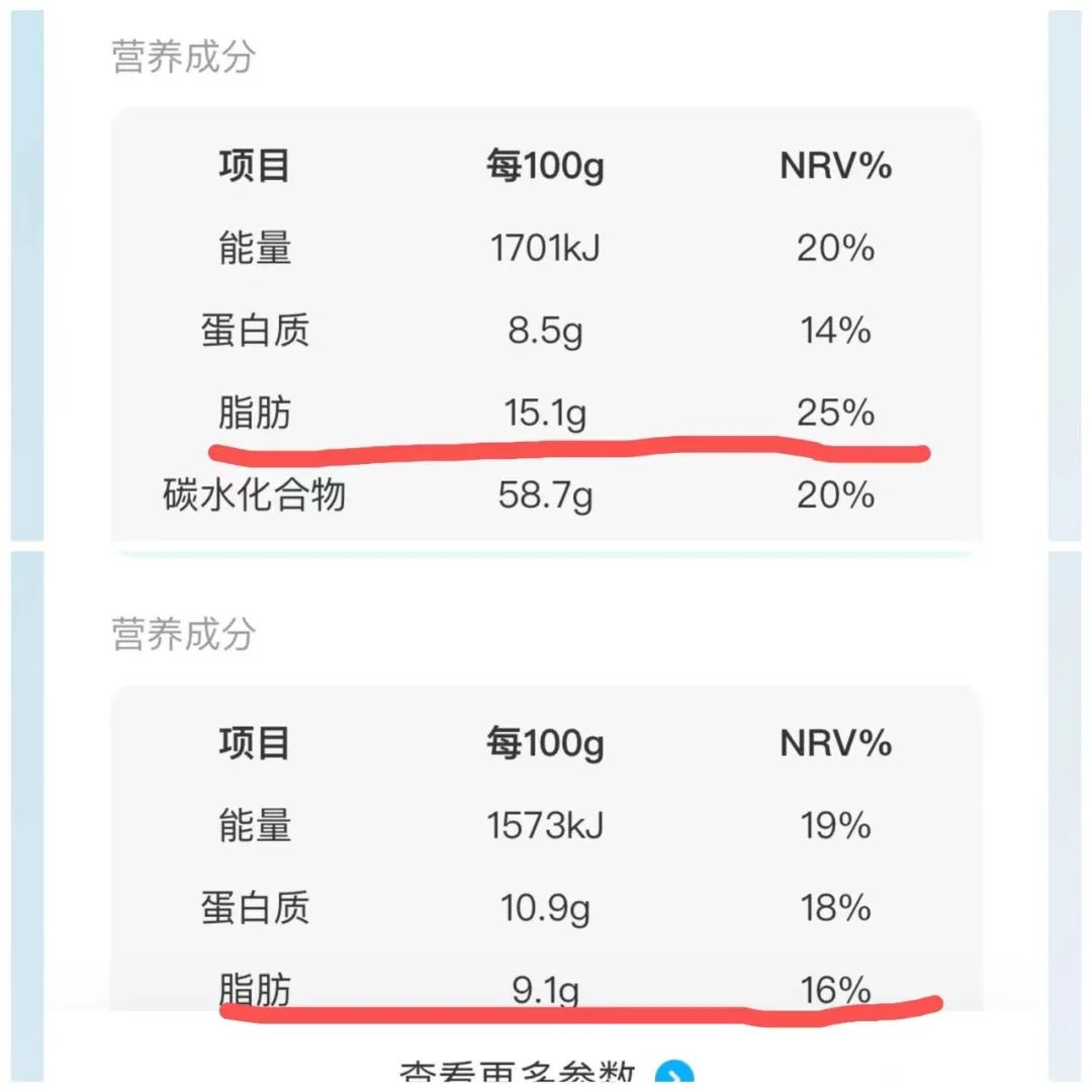 油炸的方便面(上)与非油炸的方便面(下)营养成分对比