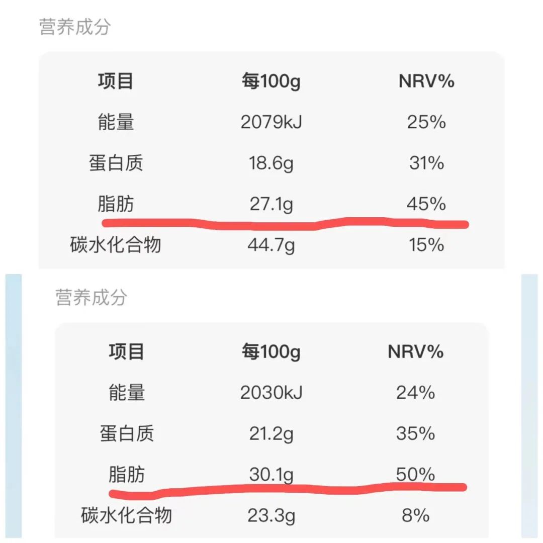 油炸的海苔片(上)和非油炸的海苔片(下)营养成分对比