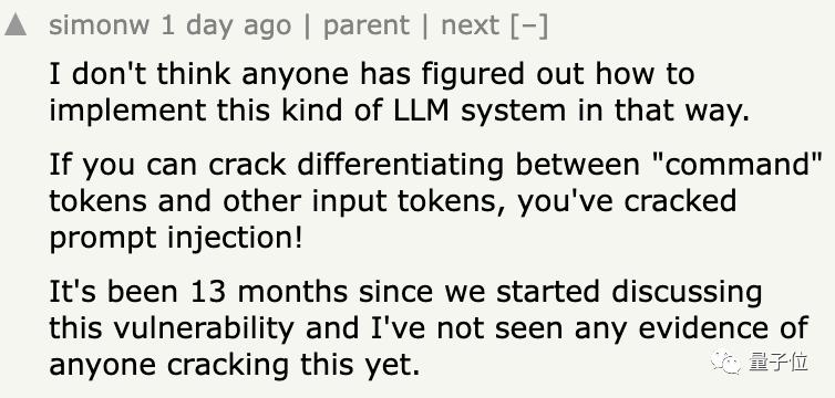 长期关注提示注入攻击的程序员大佬Simon Willison表示,如果能破解命令token和其他token之间的区别,就能解决这一漏洞。但是近一年内,还没有人提出有效解决方法。