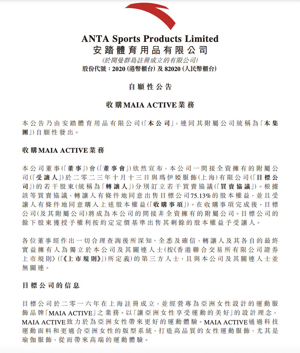 2023年10月16日,安踏体育用品有限公司发布《收购MAIA ACTIVE业务》公告,公告称安踏收购MAIA ACTIVE(以下简称“MAIA”)75.13%的股权,具体收购价格未公布。截至收盘,安踏股价涨0.83%,报90.6港元/股,总市值2566亿港元。