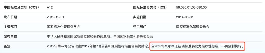 这意味着,这个执行了将近20年的强制性标准,从此变成了推荐性标准。而标准里涉及到的关于耐久性标签的内容,也不再做强制性的统一要求。此次改变的目的是精简强制性标准,只将事关人身健康和生命财产安全、国家安全和生态环境安全的相关内容做强制要求。而服装标签并不符合强制性要求包含的内容,被转化为推荐性标准。