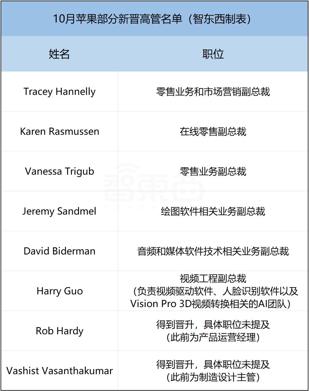 每年10月都是苹果员工晋升的集中时段,所以每年10月苹果人事变动都会更频繁,今年也不例外。这次从零售、运营、软件工程到硬件技术部门,苹果有多位新晋副总裁。