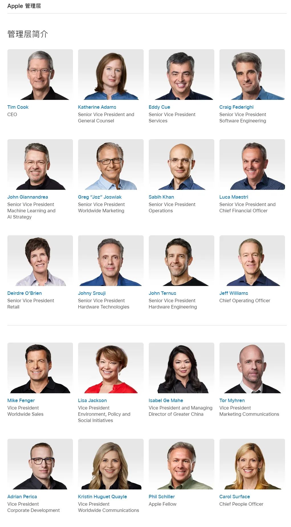 苹果官网显示的苹果主要管理层成员,来源:苹果