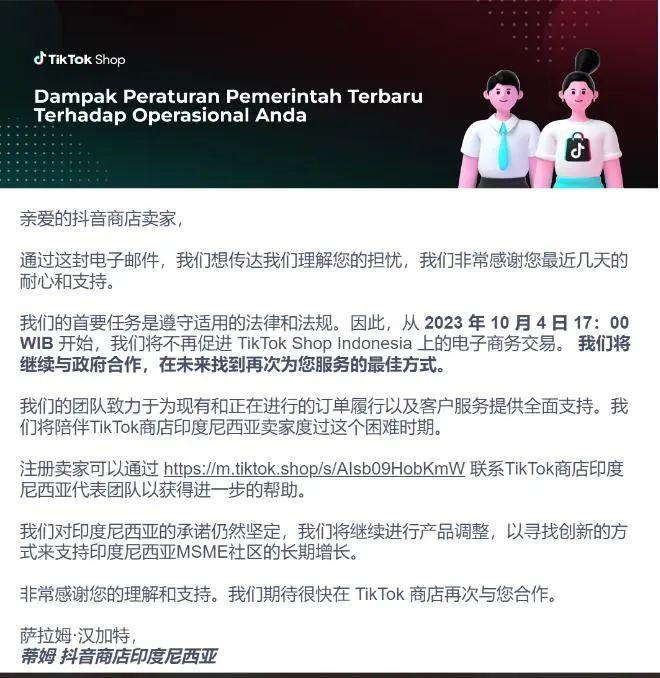 “这次事情发生得比较突然,背后原因比较复杂。”据报道,6天后的10月10日,TikTok电商负责人康泽宇在内部沟通中如此总结,并表示:“(TikTok)仍在与有关当局积极讨论,以找到持续为印度尼西亚企业和用户提供良好服务的最佳方式。”