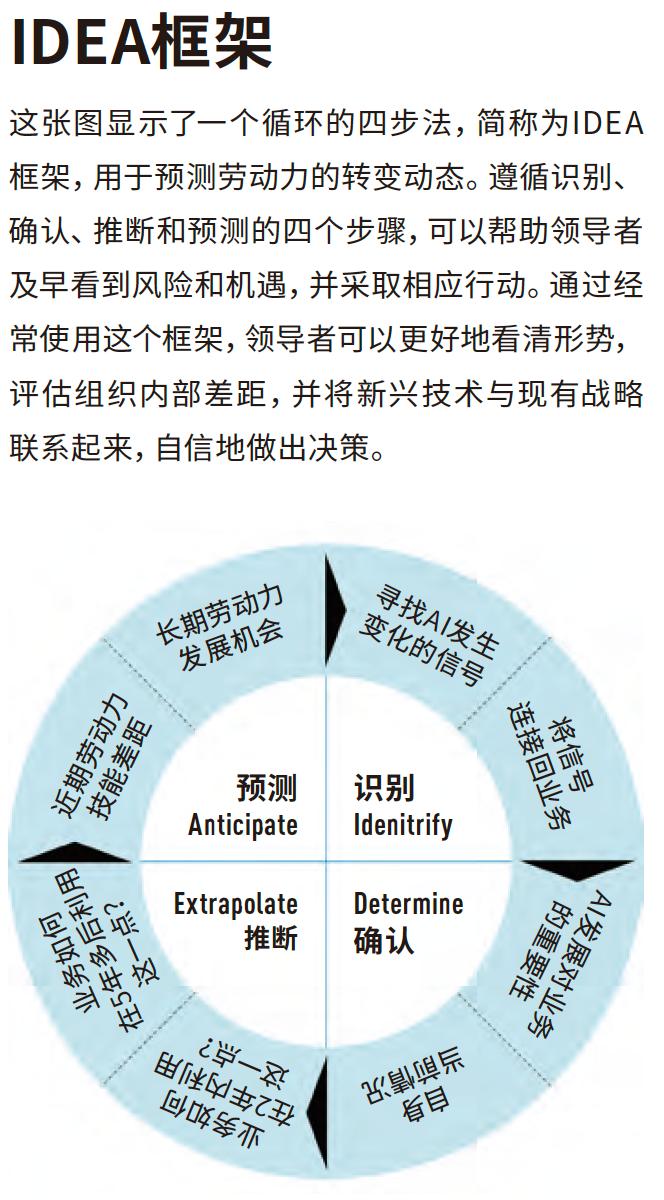 劳动力变化是技术发展带来的不可避免的副作用,领导者需要一种系统化的方式看待组织在生成式AI发展后的样子。为此,这个简单的框架可以帮助领导者预测劳动力需要如何以及何时进行变革,才能发挥AI的杠杆作用。这里的目标不是做出长期预测,而是让组织在AI不断进化的过程中做好准备(见“IDEA框架”图)。