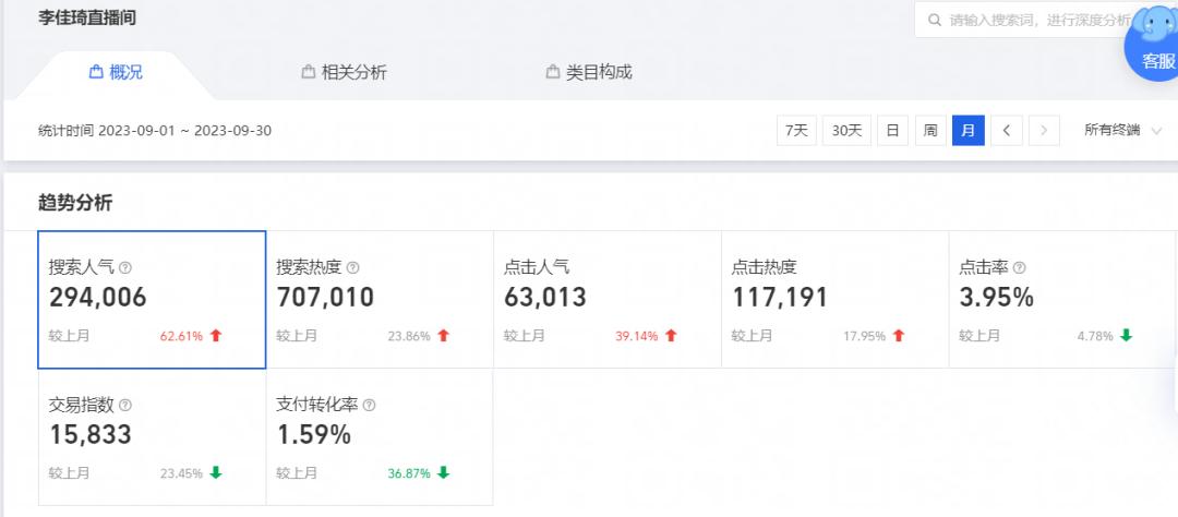 据生意参谋-搜索分析数据显示,今年9月(统计时间2023年9月1日-2023年9月30日)李佳琦直播间的搜索人气较8月暴涨62.61%,搜索热度、点击人气、点击热度也均有两位数的上涨幅度。但与之相反的是,9月李佳琦直播间搜索分析的交易指数较8月却下滑了23.45%,支付转化率更是暴跌36.87%至1.59%。