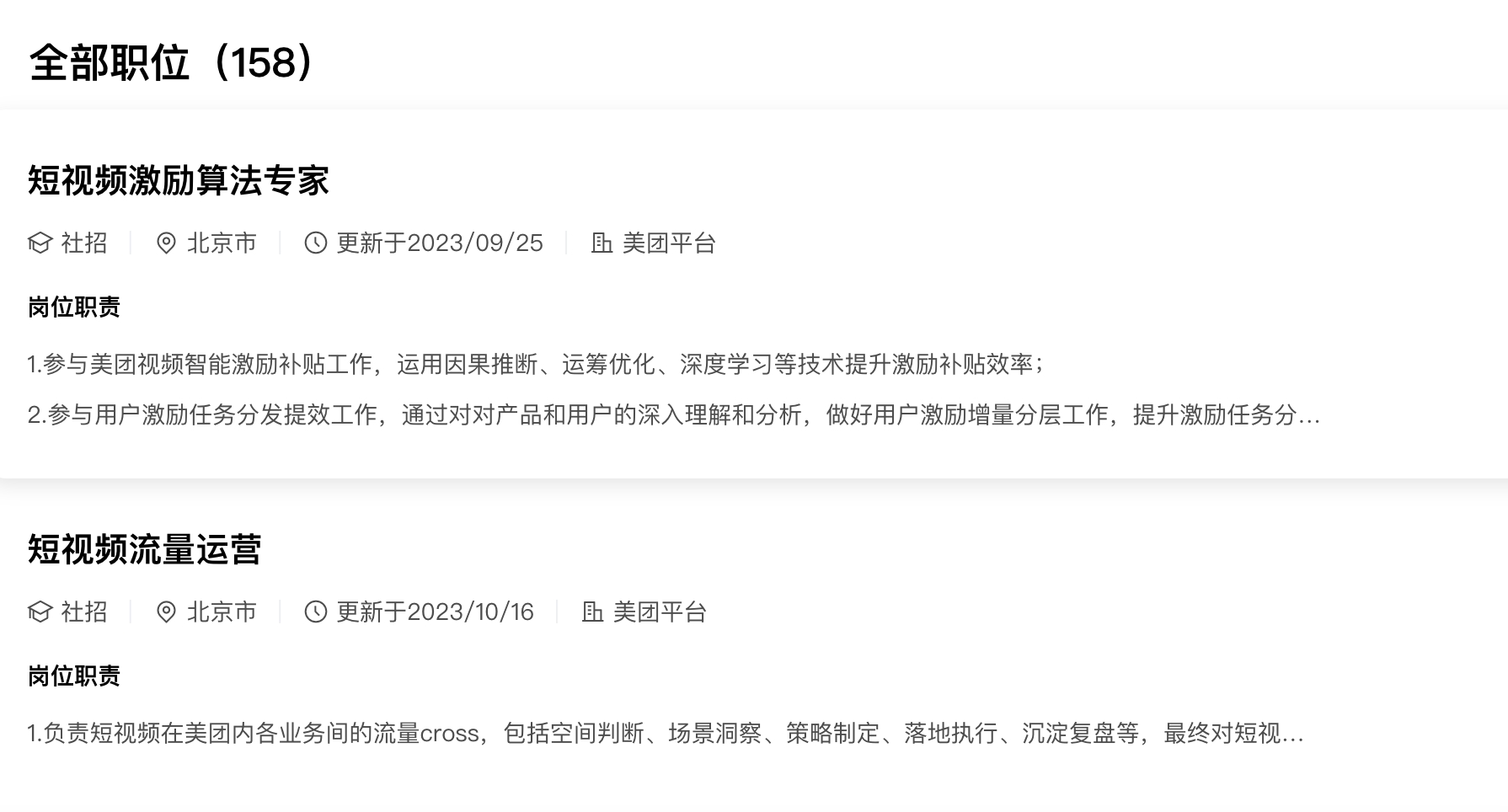 截至10月17日,美团招聘官网上挂出158个短视频业务相关岗位需求,包括了算法专家、流量运营、客户端开发、策略运营和数据分析等不同方向,基本覆盖短视频赛道全链路。在4月份,相关的职位招聘数量还仅有40多个。