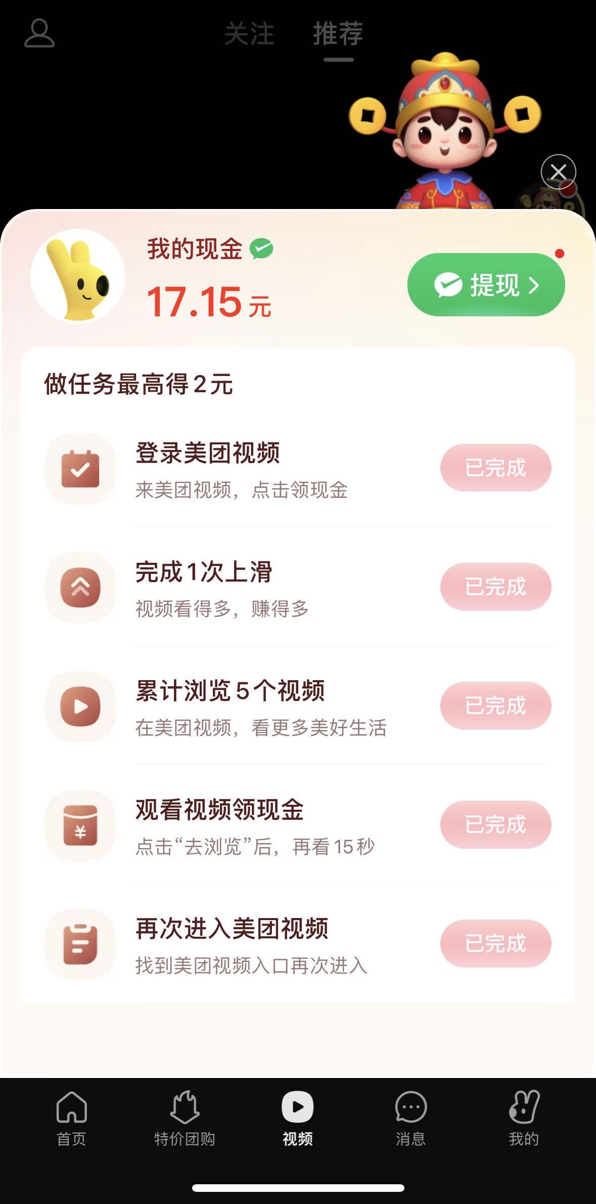 推广方法上,美团视频也借鉴了不少短视频应用通用的网赚模式——根据用户浏览时长与浏览视频数,分阶段发送红包至微信账户,成本主要有美团承担。