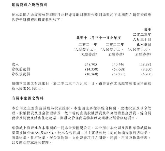 公告显示,华侨城(亚洲)挂牌出售的可销售资产2023年上半年收入1.19亿元,除税后亏损690万元。