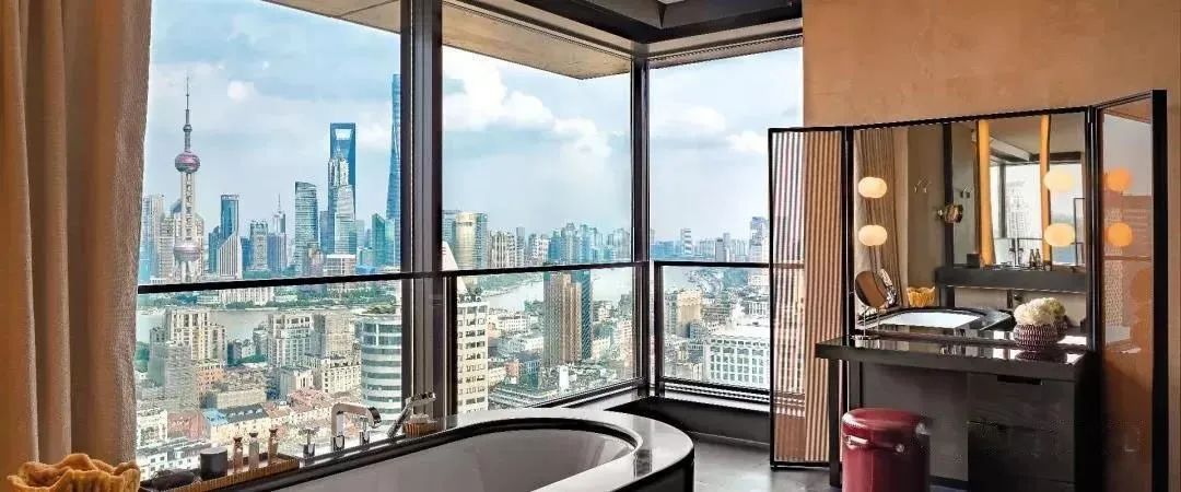 最高档的套房亮点在于外滩江景及天际线景观,酒店提供开夜床服务及管家服务,房间内有一张特大床,带羽绒被,设有办公桌,还有6台电视,面积为393平方米,最多入住3人。