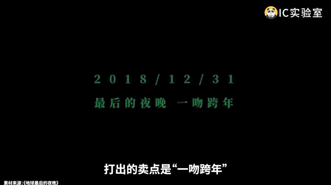 《地球最后的夜晚》选择在2018年12月31日上映,打出的卖点是「一吻跨年」,也就是买当晚21:50的场次,那么影片结束的时候,你可以和你最爱的人相拥亲吻到第二年,显然针对的是情侣。