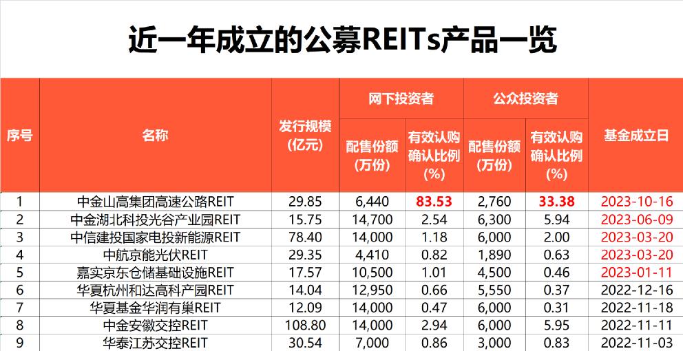 不过,从新产品的发行热度上,相比此前公募REITs产品在网下和公众投资者中较低比例获配,在今年公募REITs二级市场表现低迷阶段,发行市场也大幅降温,新产品网下有效认购确认比例从此前不足3%到超过80%;公众投资者获配比例也从同期的不到6%升至33%。