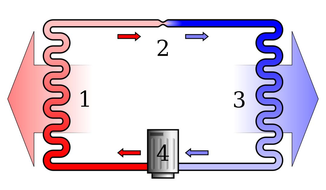 冰箱工作原理示意图,一边散热,一边制冷,核心是标注为4的压缩机丨wikimedia commons/Ilmari Karonen