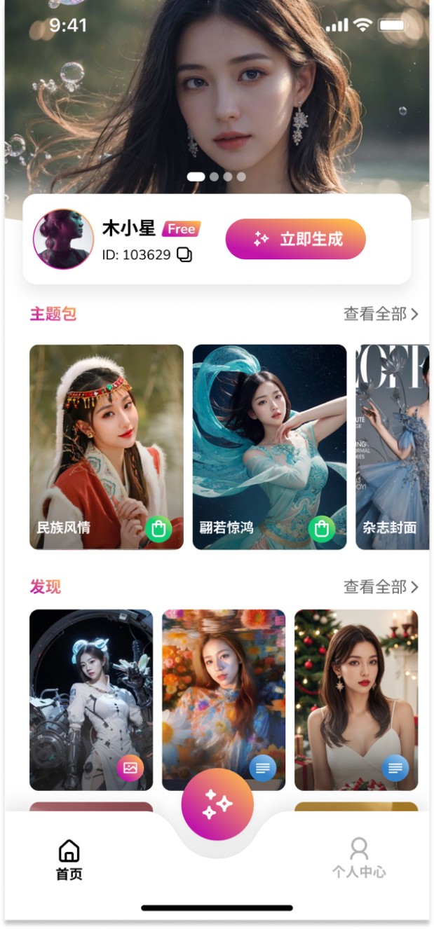 使用方法也非常简单——用户将个人照片上传至app中,完成一次性的训练,而后可以选择各种各样的生成场景和动作。同时,木目AI还有许多独家主题包,如时尚约会包、复古校园、职场精英包等。