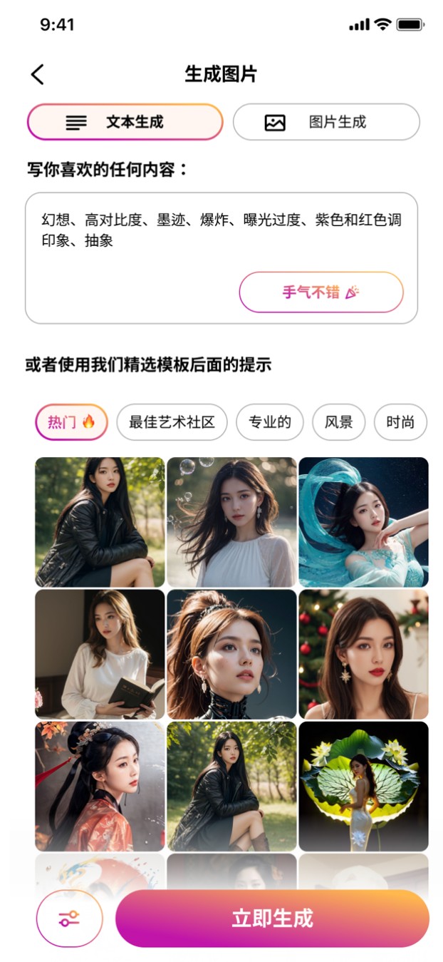从木目AI现在提供的模版来看,绝对数量上已经较为丰富多元,分为职业形象、超现实主义、艺术风格、人文艺术几大部分。