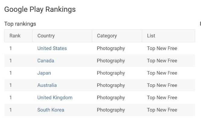 目前,木目AI在20多个国家的“新免费摄影”类目中排名第一,其中包括Google Play商店中列出的美国、加拿大、日本、澳大利亚、英国和韩国等。