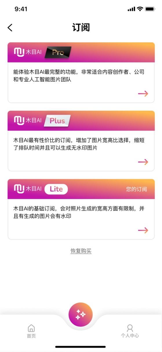 在上线后,木目AI也有一系列更新,包括推出三种模式的会员订阅计划——lite、plus和pro。不同等级的会员可获得不同的权益和积分。用户订阅lite会员用户可获得50积分,也可以升级成为plus或者pro模式,用户可以获得更多积分,可生成高清图片、选择多种图片比例、免排队、去水印等。