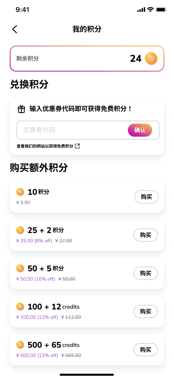 用户可以使用30个积分进行模型训练,用1个积分生成单张照片。若积分不足,用户也可再去购买积分包。如果需要重新训练模型,则要花费30积分(约30元)。