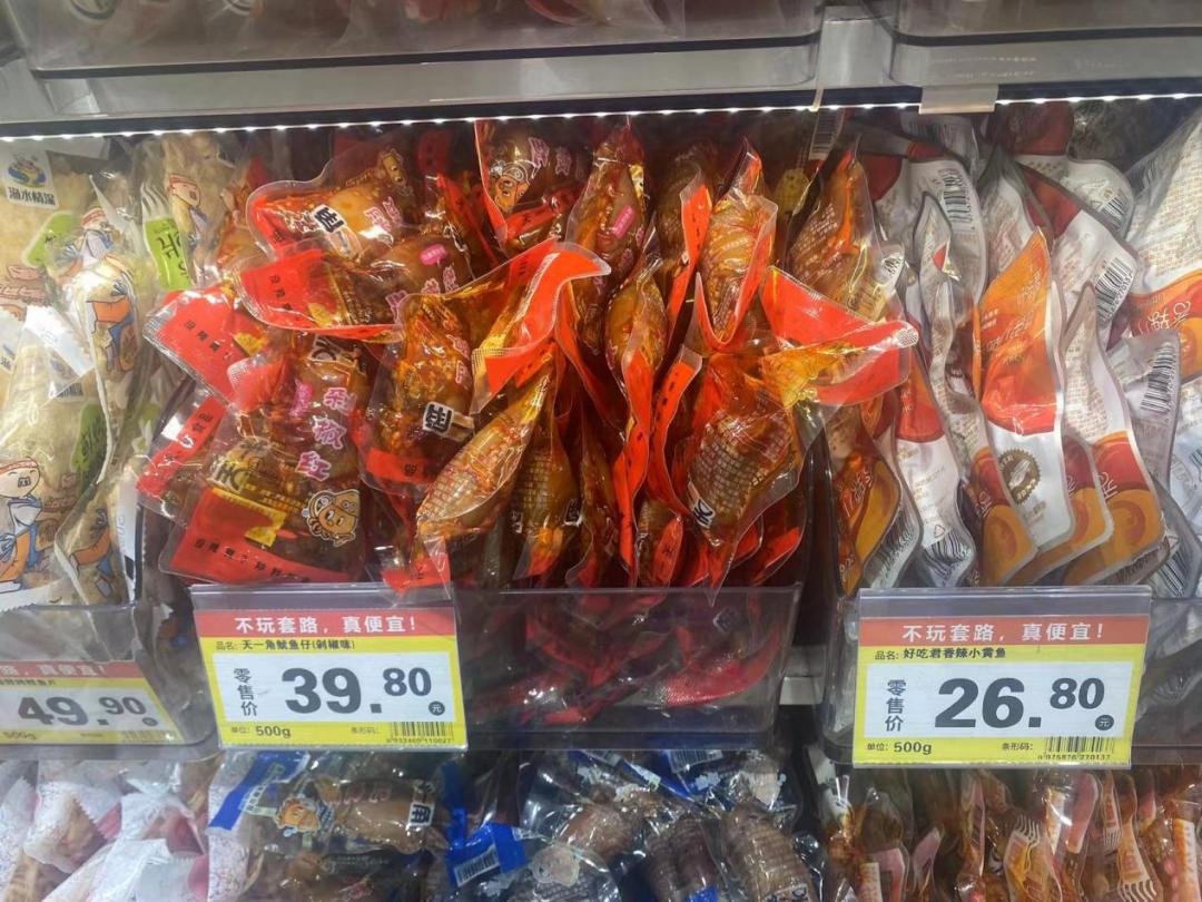 为了提高利润,部分零食折扣店开始在定价上动起小心思。安徽省界首市消费者赵敏告诉我们,当时自己去来优品购买一款鱿鱼仔商品时,价格显示为39.8元/斤。但在拼多多上,鱿鱼仔的普遍价格约在20-25元/斤。意识到自己被“套路”后,现在自己很少再去来优品购买零食了。