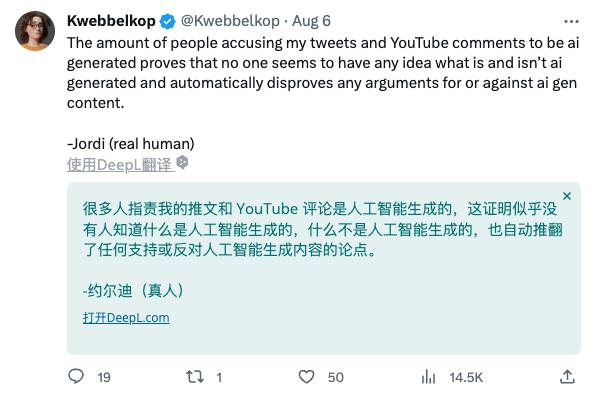 他说的似乎也不无道理。自从 Kwebbelkop 宣布使用 AI 制作视频后,有很多人开始指责他发的推文和 YouTube 评论也是由 AI 生成的。但他直接嘲笑这些人根本分不清哪些内容是 AI 生成的。他最后还不忘在推文结尾署名「 Jordi (真人)」。