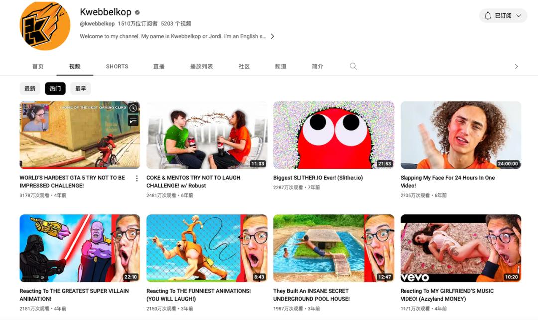 Kwebbelkop 是一名坐拥 1510 万名粉丝的 Youtube 游戏主播,与李子柒的 1790 万的粉丝量相当,可以说是妥妥的 YouTuber 顶流。