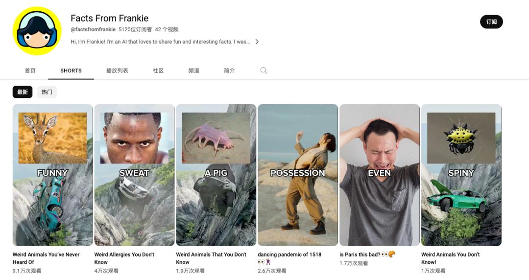 该频道是 YouTuber Jensen Tung 的实验,他成功在 1 个月里通过 AI 创作的短视频获得近 10 万播放量