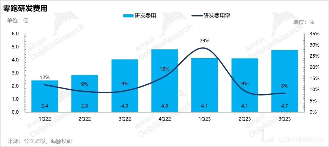 研发上,零跑坚持全域自研,在关键的三电系统上(除电芯),智能座舱,智能驾驶硬件和算法上都做到全部自研,三季度研发费用 4.7 亿,比上季度略有提升 0.6 亿,但低于市场预期 6 亿。