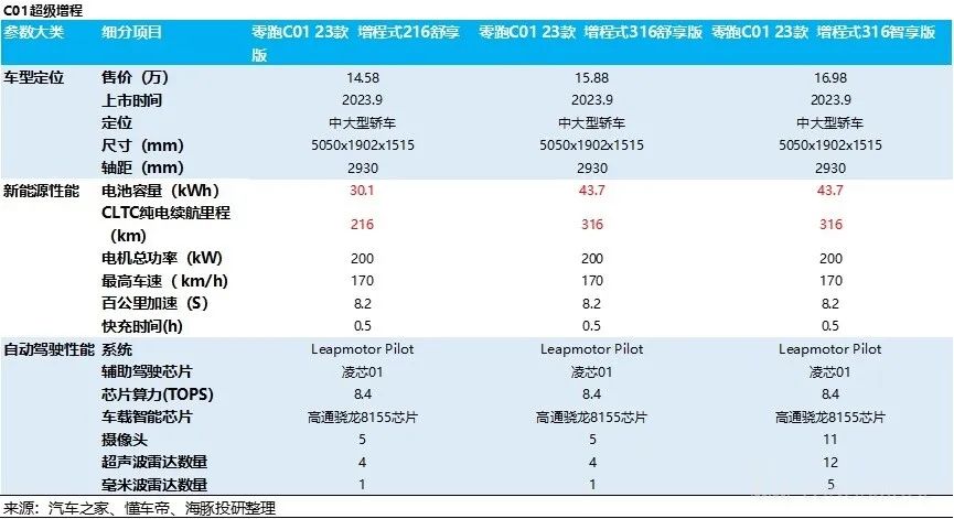 继零跑于 3 月推出 C11 增程款切入插混赛道,零跑抓住了增程车主要解决里程焦虑的这一优势,销量持续拉涨,而 9 月又推出了 C01 和 C11 超级增程款,继续强化这一优势,高配版将增程款的纯电续航能力提升到了 300 公里以上(CLTC 工况),相比同行做到的增程车的普遍的纯电续航在 100 公里-200 公里之间,零跑在增程车竞争中打出了差异化的优势。