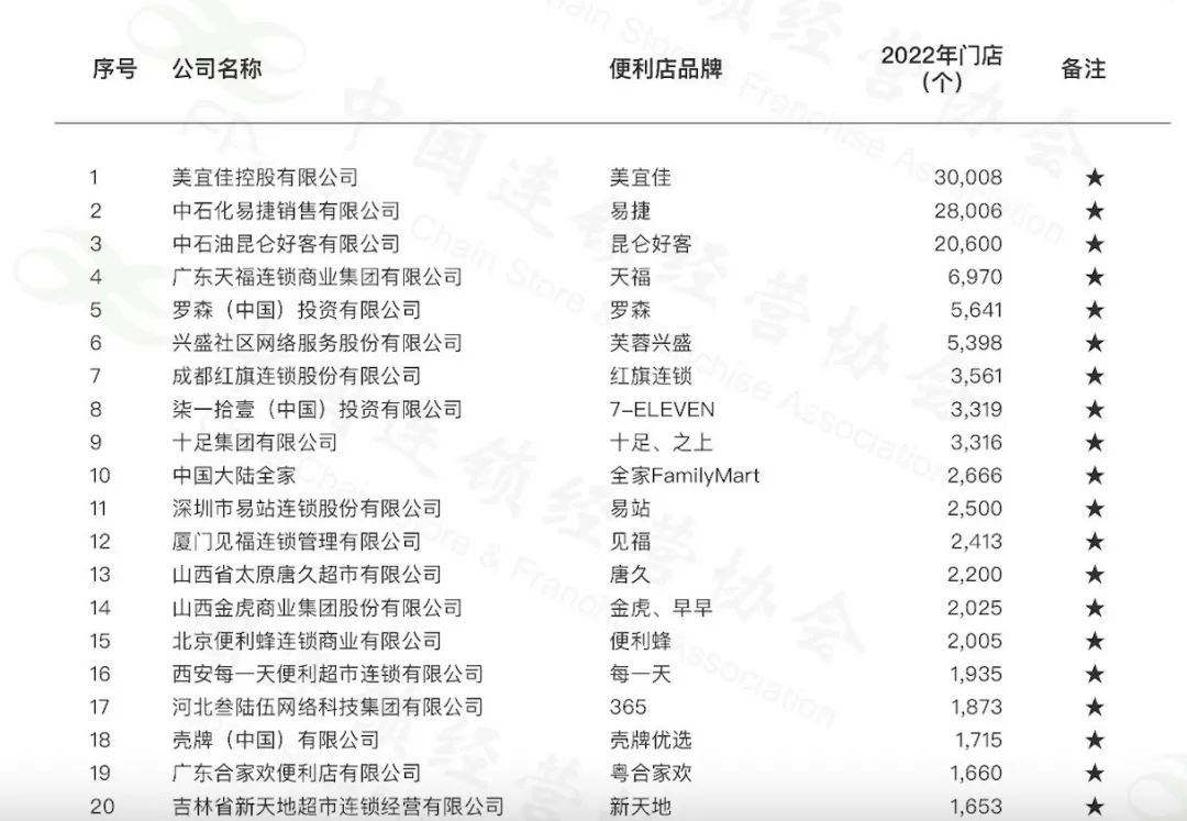 头部的几大品牌连锁便利店,以2022年企业门店数量来说,美宜佳、易捷、昆仑好客排名前三,分别拥有门店30008家、28006家、20600家;日系便利店品牌罗森、7-ELEVEN分别拥有门店5641家、3319家。