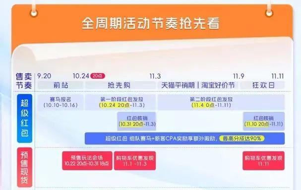 此次大促整体被分为3个阶段,9月28日商家报名通道正式开启至10月20日零点为蓄水期,10月20日至11月11日为正式期,11月12日则为大促返场期。