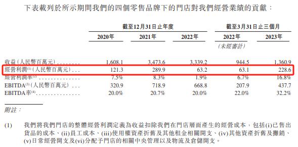 值得一提的是,与前文谈及的经营利润不同,KK集团四大品牌的门店经营利润在2020年至2022年以及2023年第一季度均为正数,分别为1.21亿元、2.9亿元、0.63亿元、2.29亿元。关于门店经营利润的定义,KK集团在申报稿中表示,是指收益扣除公司在门店层面产生的经营成本,包括(i)已售出货品的成本、(ii)员工成本、(iii)使用权资产折旧及其他租金相关开支、(iv)其他资产折旧及摊销、 (v)日常经营开支及(vi)分配予门店的相关中央管理以及物流及仓储开支。