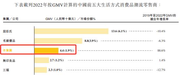 根据弗若斯特沙利文报告,以GMV(商品价值总额)计,KK集团2022年是中国第三大生活方式消费品潮流零售商,市场份额为1.9%,不到第二名名创优品的一半,不及第一名屈臣氏三分之一。同时该报告指出,KK集团是前十大参与者中增长最快的,2019年至2022年的复合年增长率为88.6%。