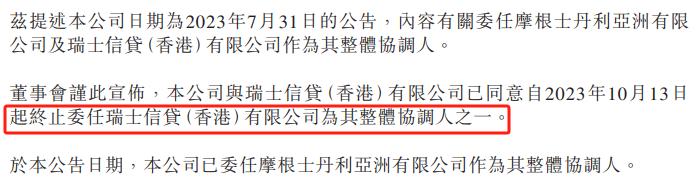 关于为何终止整体协调人协议,KK集团对观察者网表示,因今年年初的大环境原因,包括瑞士信贷在内的欧美银行业出现动荡。综合各方面因素的考量,KK集团将整体协调人进行调整。