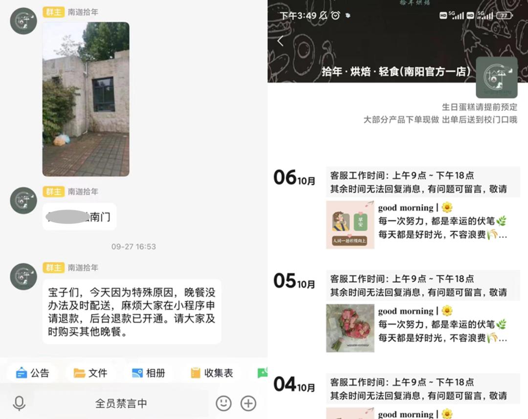 她分享了她所在的学校的送餐群的截图,该群全员禁言中,最后一条消息是今年9月27日,名为“南迦拾年”的群主称因为特殊原因无法及时配送,要求学生申请退款。
