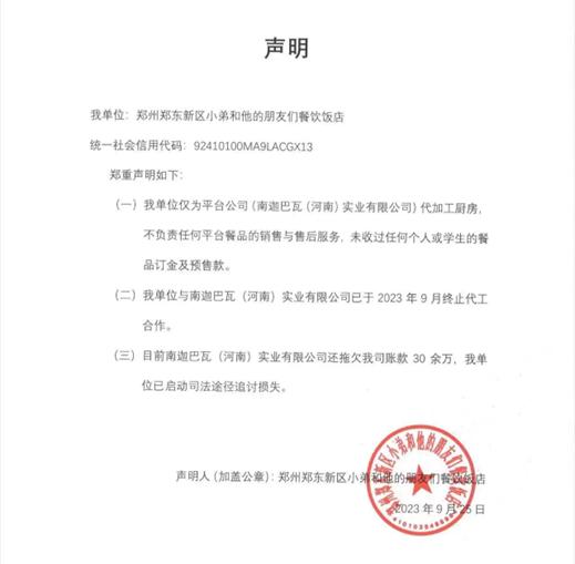 声明称,其仅为平台公司的代加工厨房,不负责任何平台餐品的销售和售后服务,未收集过任何个人或学生的餐品订金及预售款。且与平台的代工合作已于2023年9月终止。南迦巴瓦仍拖欠账款30余万元。