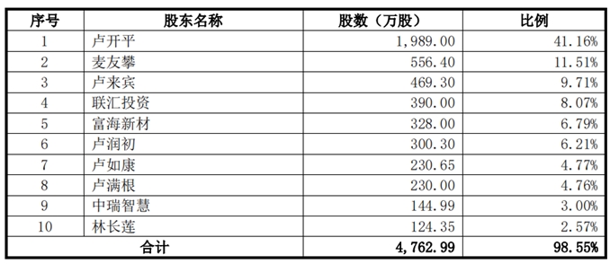 江南大学工商企业管理专业的本科生卢开平持股49.23%,是公司实控人。中山大学高分子化学专业的本科生麦友攀持股11.51%,麦友攀是公司董事。而卢开平的兄弟卢来宾、卢满根和他妻子、卢如康四人都持有公司股份。