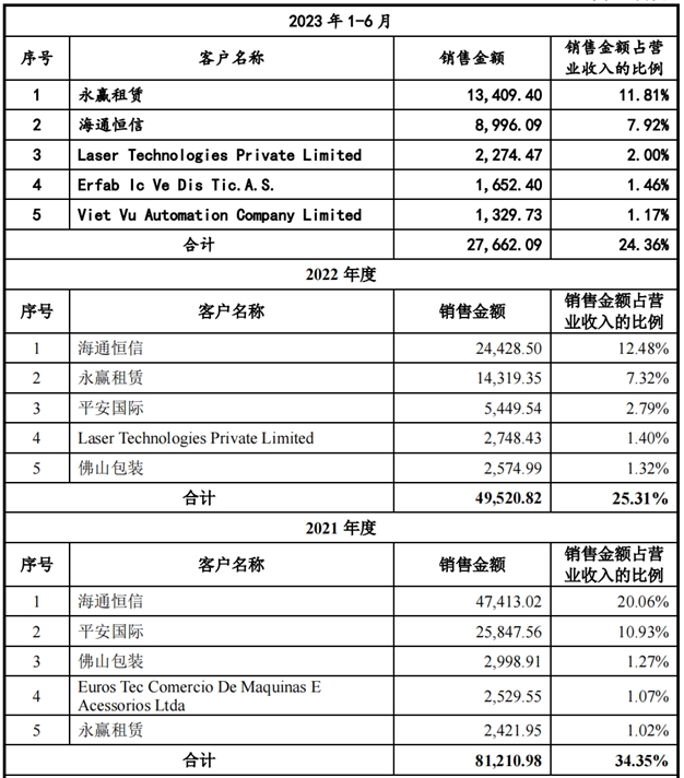 2020年境外收入占比14.49%,2022年占比已达23.87%。特别在今年上半年,宏石激光的境外收入升至28.48%。在其前5大客户中,有三家企业分别来自印度、越南和土耳其。