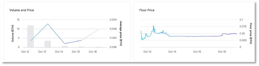 从Meelier Milo在Opensea交易情况来看,该NFT的公售价为0.05 ETH(约57美元),发行5天后,目前的地板价仍为0.05 ETH,没涨没跌。这意味着,Meelier Milo并没有在二级市场中得到充分交易,没有流动性。到了10月18日,该NFT系列的地板价终于动了,变成了0.034 ETH,较发售价跌了32%。