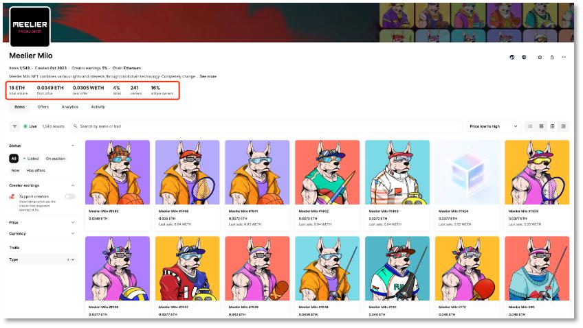 Meelier Milo在Opensea的销售总额约18 ETH(约2.7万美元),而本次发售的2000个NFT,到现在还没卖完,持有地址数为241个。