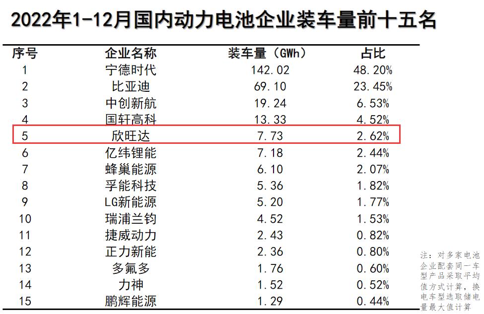 市占率方面,根据中国汽车动力电池产业创新联盟统计,2022年欣旺达在国内动力电池市场的占有率为2.62%,排名国内第五。