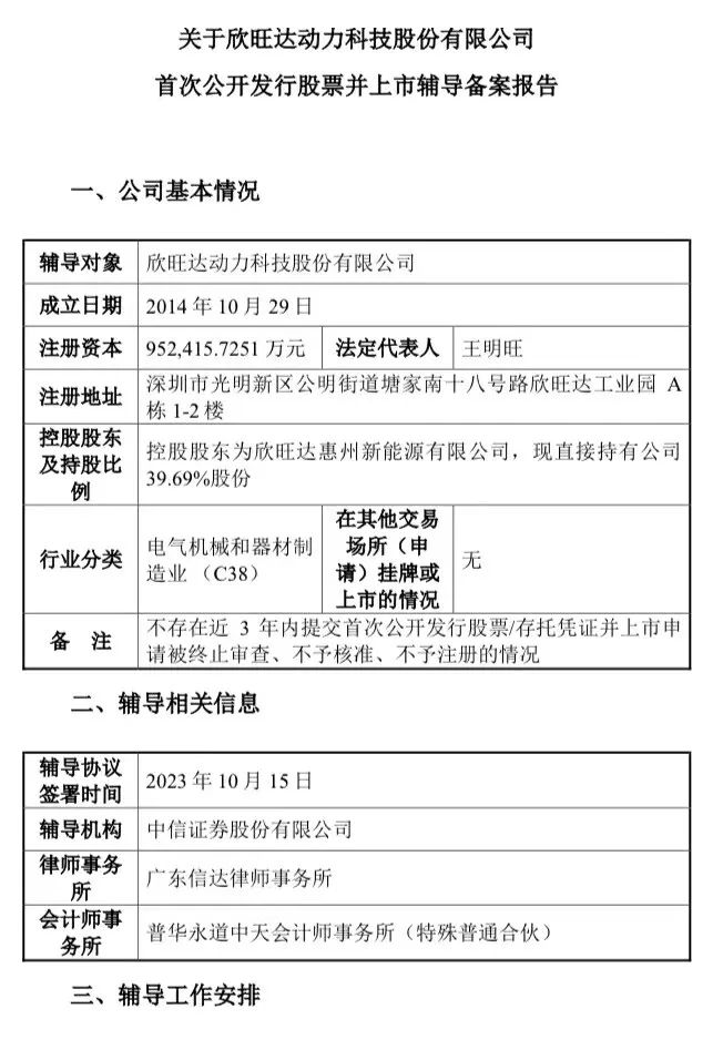 备案报告显示,欣旺达动力于今年10月15日签署上市辅导协议,辅导机构为中信证券。