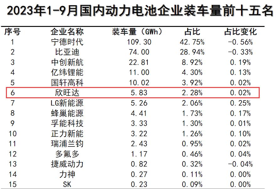 最新数据显示,今年1-9月,欣旺达动力电池装车量为5.83GWh,占比2.28%,排名国内第六位。