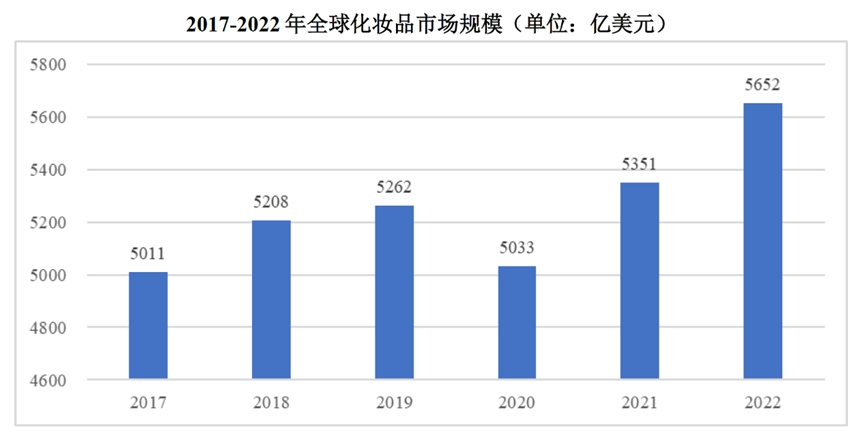 最近五年来,全球化妆品市场规模总体呈增长趋势。根据前瞻产业研究院的数据,2022年全球化妆品市场规模已达到5652 亿美元,这比泰国2022年的GDP总量还要高出300亿美元。