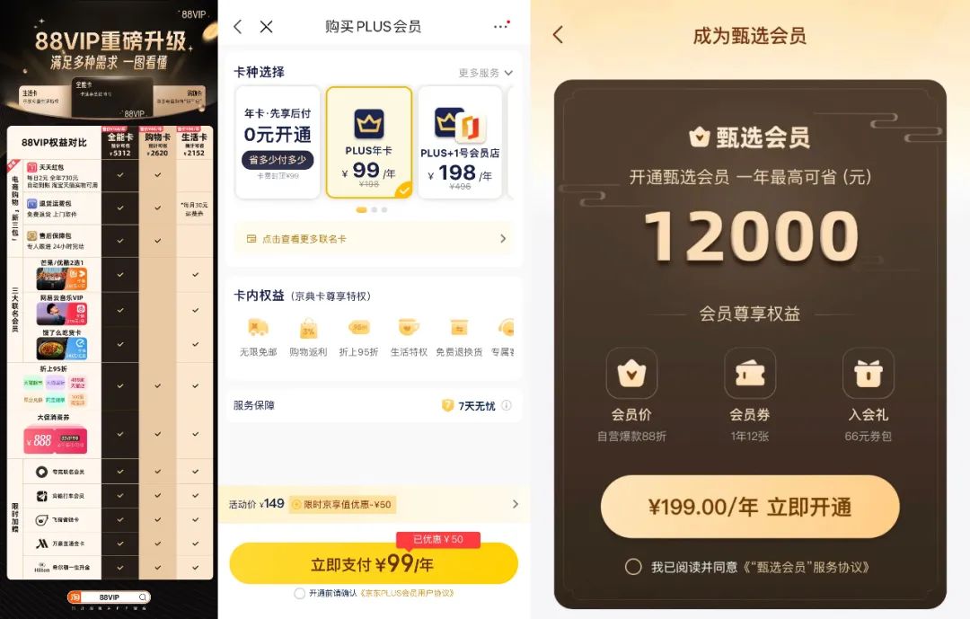 对互联网平台而言,付费会员并不陌生,淘宝有88VIP,京东有京东PLUS。不过相比较而言,东方甄选的会员价格并不便宜,淘宝88VIP目前则是88-168元/年,京东PLUS会员99-149元/年;但低于山姆、Costco、盒马等线下会员店的价格。国内的山姆会员店目前是260元/年,Costco则是299元/年,盒马超市会员258元/年。