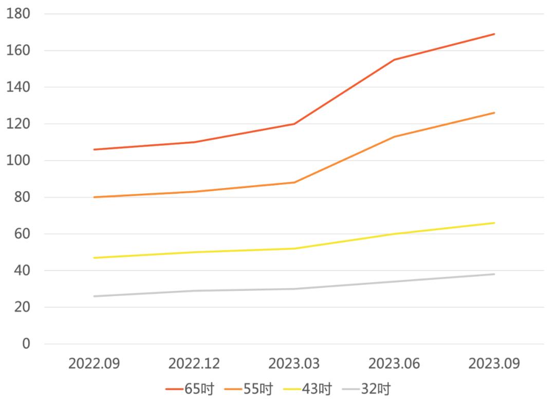 2022年底以来,面板行业的周期性再次生效,面板价格开始从低位回升。根据 Witsviews数据,截至2023年9月底,65吋/55吋/43吋/32吋电视面板均价分别为169美元/126美元/66美元/38美元,较2022年9月底上涨59.43%/57.50%/40.43%/46.15%。这其中,属于各大厂商发力重点的大尺寸电视面板,价格上涨的速度反而更加明显。
